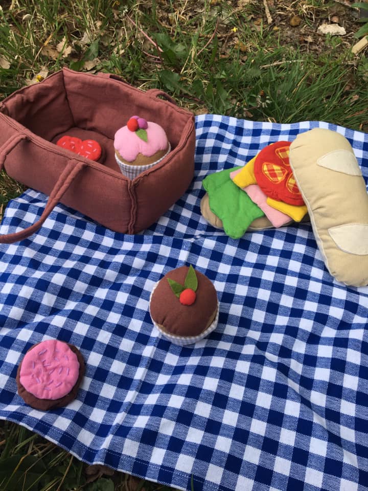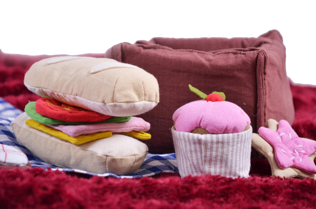 A picnic is always lovely, except for problems with the weather...or wasps...or ants. Avoid these annoyances with our picnic play set. The set comes in its own basket, with a blue and white check picnic blanket. It contains a cheese, ham, tomato and lettuce sub sandwich with two cupcakes and four assorted cookies. The picnic set is CE marked suitable from birth and machine washable.